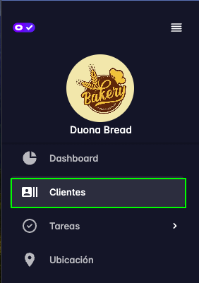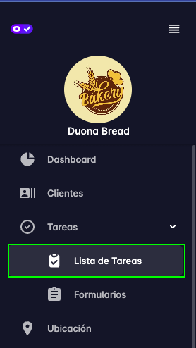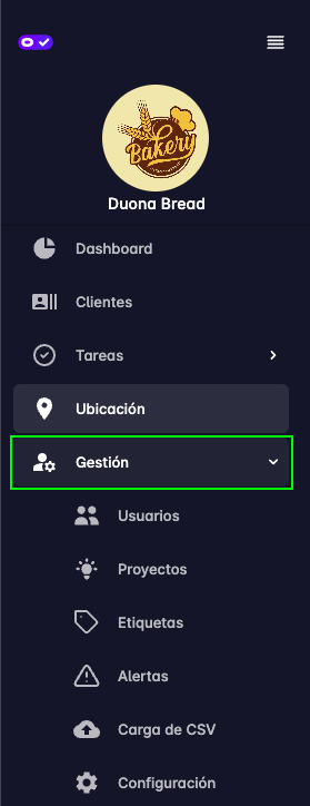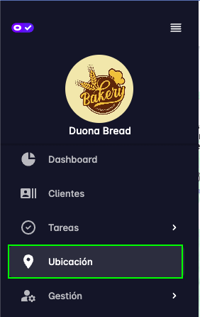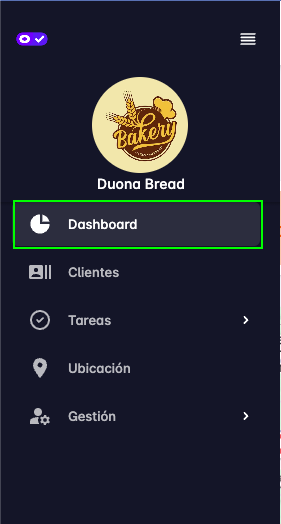 Luego aparecen los enlaces para navegar a las funcionalidades de: Dashboard, Clientes, Tareas, Ubicación, Gestión.