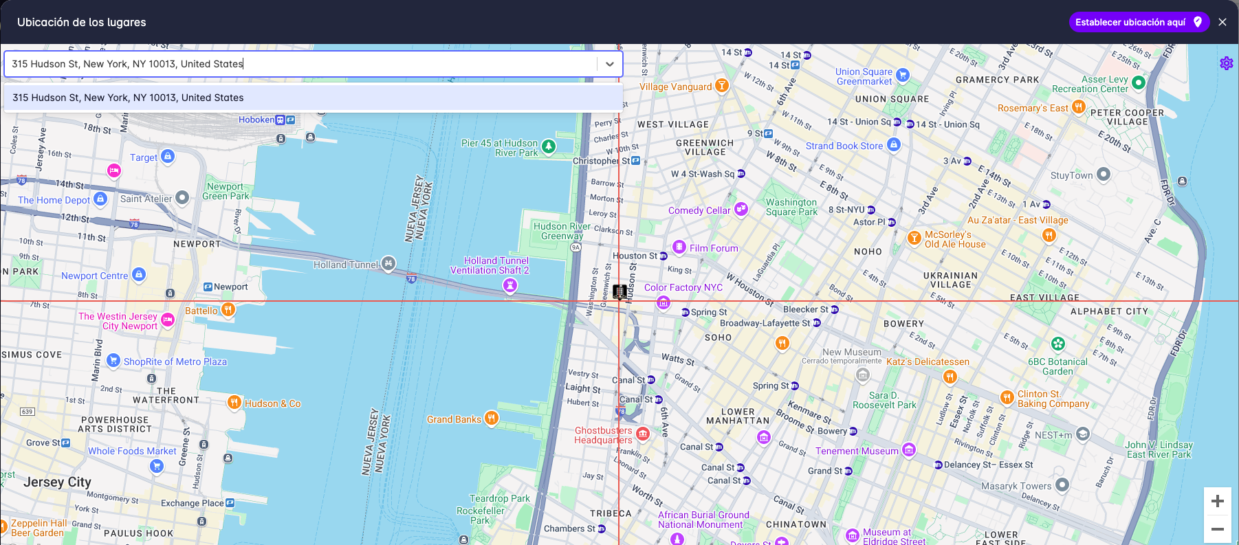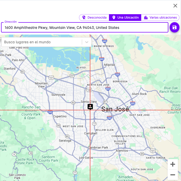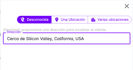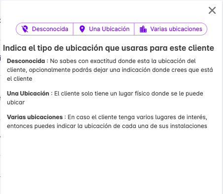 Si eliges "Una ubicación" se desplegará un formulario donde podrás ingresar la dirección del cliente y un mapa donde podrás colocar la ubicación exacta del cliente. Esto es muy útil para que los usuarios puedan usar Apps de navegación al momento de hacer entregas o visitas al cliente.