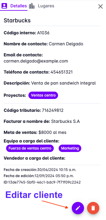 Para editar un cliente da clic en el botón de edición que aparece en la parte derecha del panel donde se muestra el detalle del cliente.