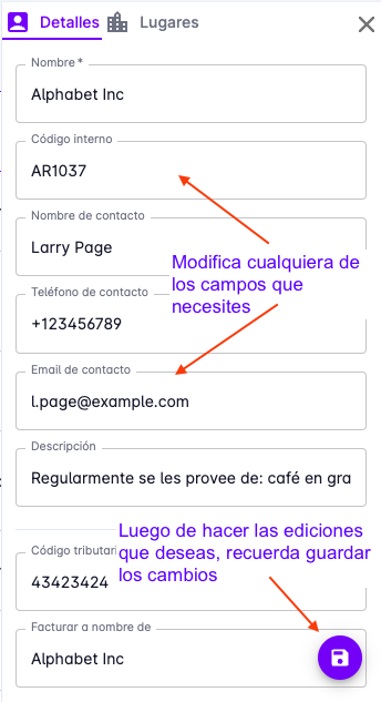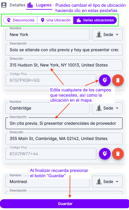 Si también necesitas modificar información de la ubicación del cliente puedes hacerlo en la sección de ubicación. Presiona la pestaña de "Ubicación" o "Lugares" para acceder a la información de la dirección del cliente.