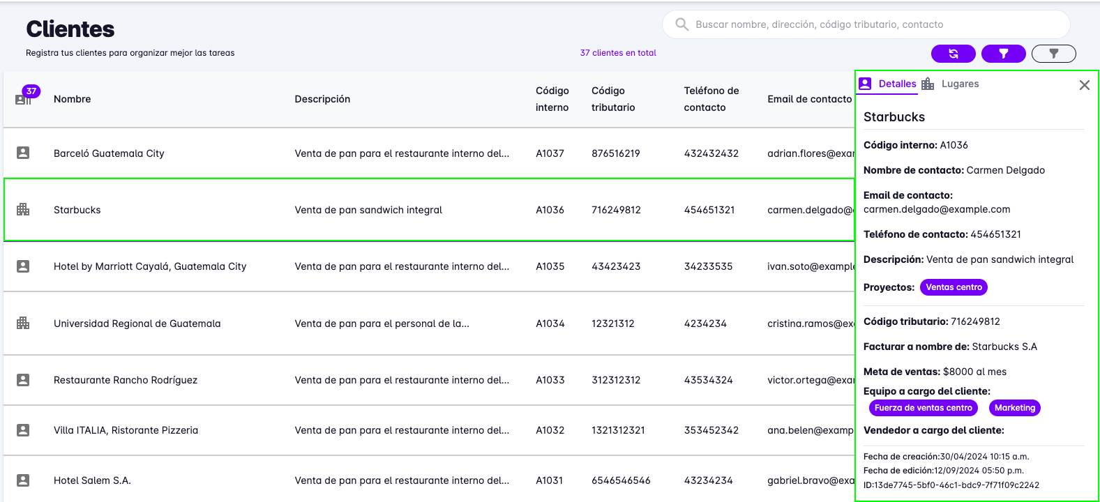 Esta acción abrirá en la misma página un panel en la parte derecha, donde se mostrarán los detalles del cliente.