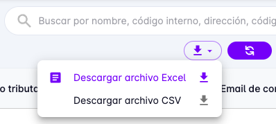 Para descargar los clientes, presiona el botón de descarga en la parte superior derecha de la pantalla. Está disponible la opción de descargar en formato Excel y CSV.