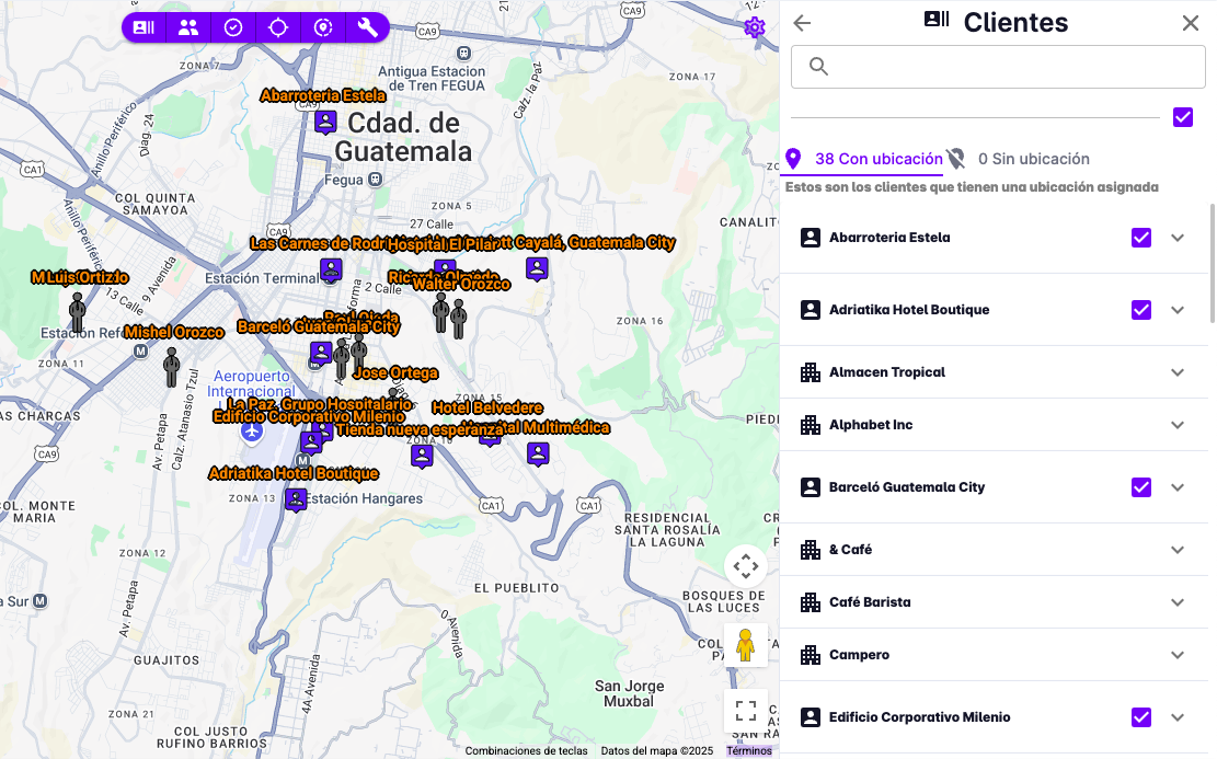 Se mostrará un mapa con la ubicación de los clientes, mostrando un marcador por cada cliente y lugares vinculados al cliente (sedes, tiendas, sucursales). Estos son clientes que tienen una ubicación geográfica registrada.