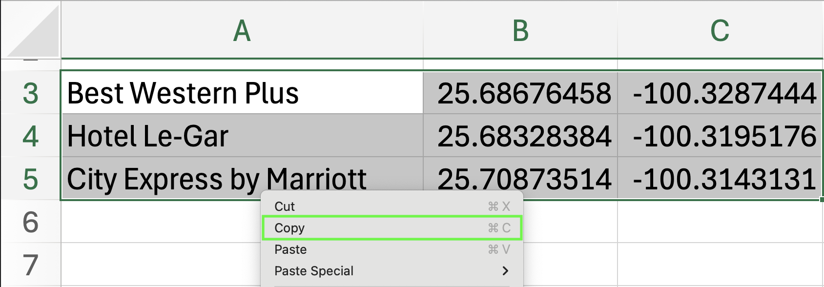 Para copiar los puntos desde Excel, selecciona las celdas que contienen los puntos y copia el contenido.