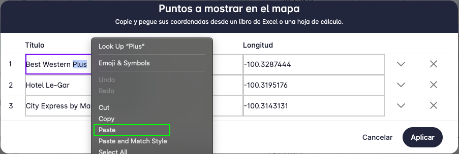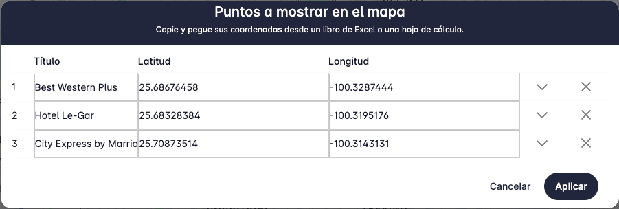 Notarás que los puntos se han copiado en el formulario de la lista de puntos en el mismo orden que los tenías en Excel. Presiona el botón Aplicar para visualizar los puntos en el mapa.