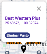 Se mostrará un marcador en el mapa con el título que ingresaste. Al dar clic sobre el marcador se mostrará el título del punto, sus coordenadas y un botón para eliminar el punto.