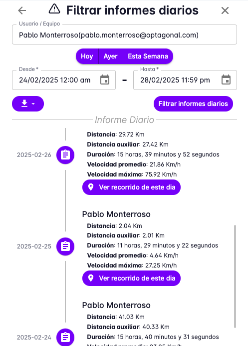 El informe diario es un reporte del recorrido de los usuarios en un día específico, se muestra la distancia recorrida, el tiempo que estuvo activo en el día, velocidad promedio, velocidad máxima.