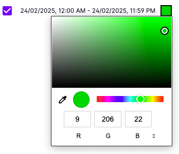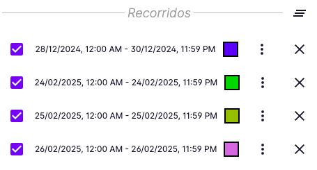 En el listado de recorridos se muestra el rango de fecha aplicado, un checkbox para ocultarlo en el mapa, un selector de color, botones para descargar archivos y un botón para eliminar el filtro. El selector de color puede ser una funcionalidad muy útil para diferenciar los recorridos de los usuarios, puede cambiar al color que desee.