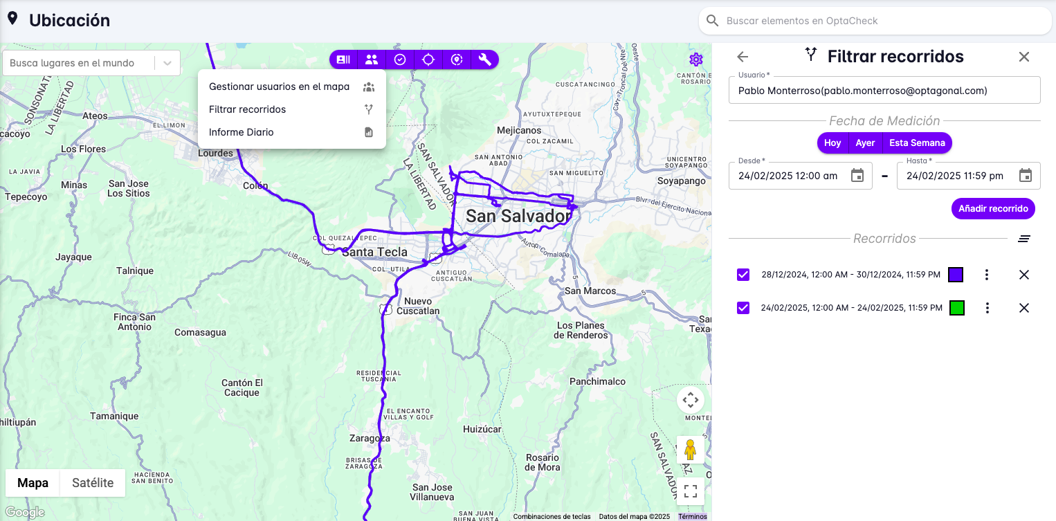Selecciona el botón Filtrar recorridos para ver los controles que nos permitirán ver los recorridos de los usuarios.