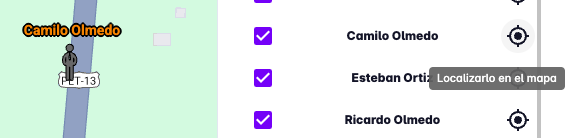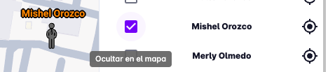 Cada usuario en ese listado tiene unos botones para ubicar al usuario en el mapa y ocultarlo del mapa.