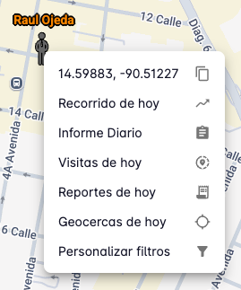 Al dar clic derecho sobre el marcador de un usuario se mostrará un menú contextual con opciones para copiar coordenadas, compartir ubicación por medio de un enlace, ir a su informe diario, visitas de hoy, tareas completadas hoy, geocercas de hoy.