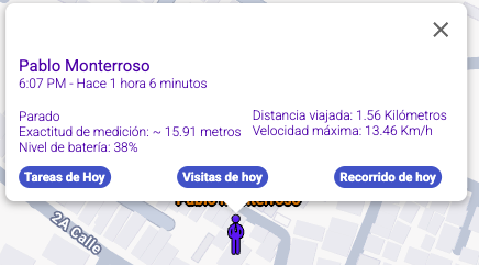 En esta información se muestra el nombre del usuario, la velocidad a la que se desplaza, la fecha y hora de la última actualización y unos botones para ver su recorrido, tareas completadas y visitas realizadas.
