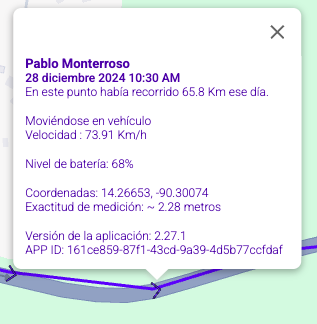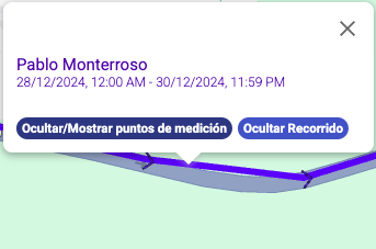 Si desea ver los puntos de medición que se usan para dibujar el recorrido, coloque el cursor sobre la línea del recorrido, luego de clic sobre la línea, esto causará que se muestre una ventana con la información sobre el recorrido y un botón para ver los puntos de medición.