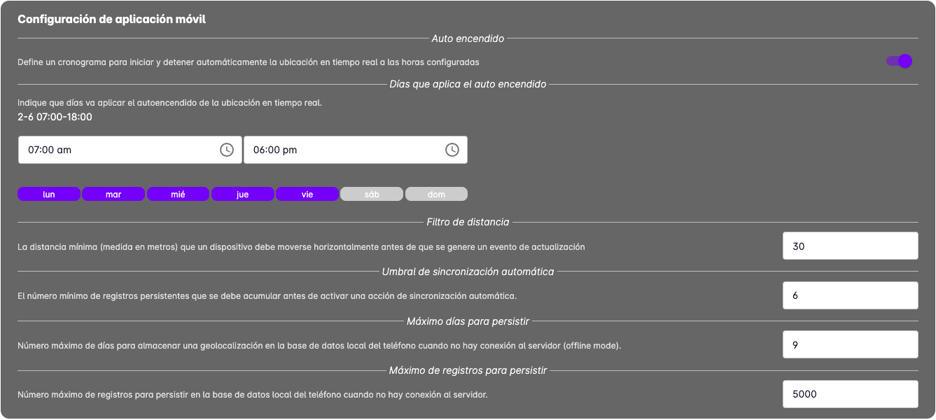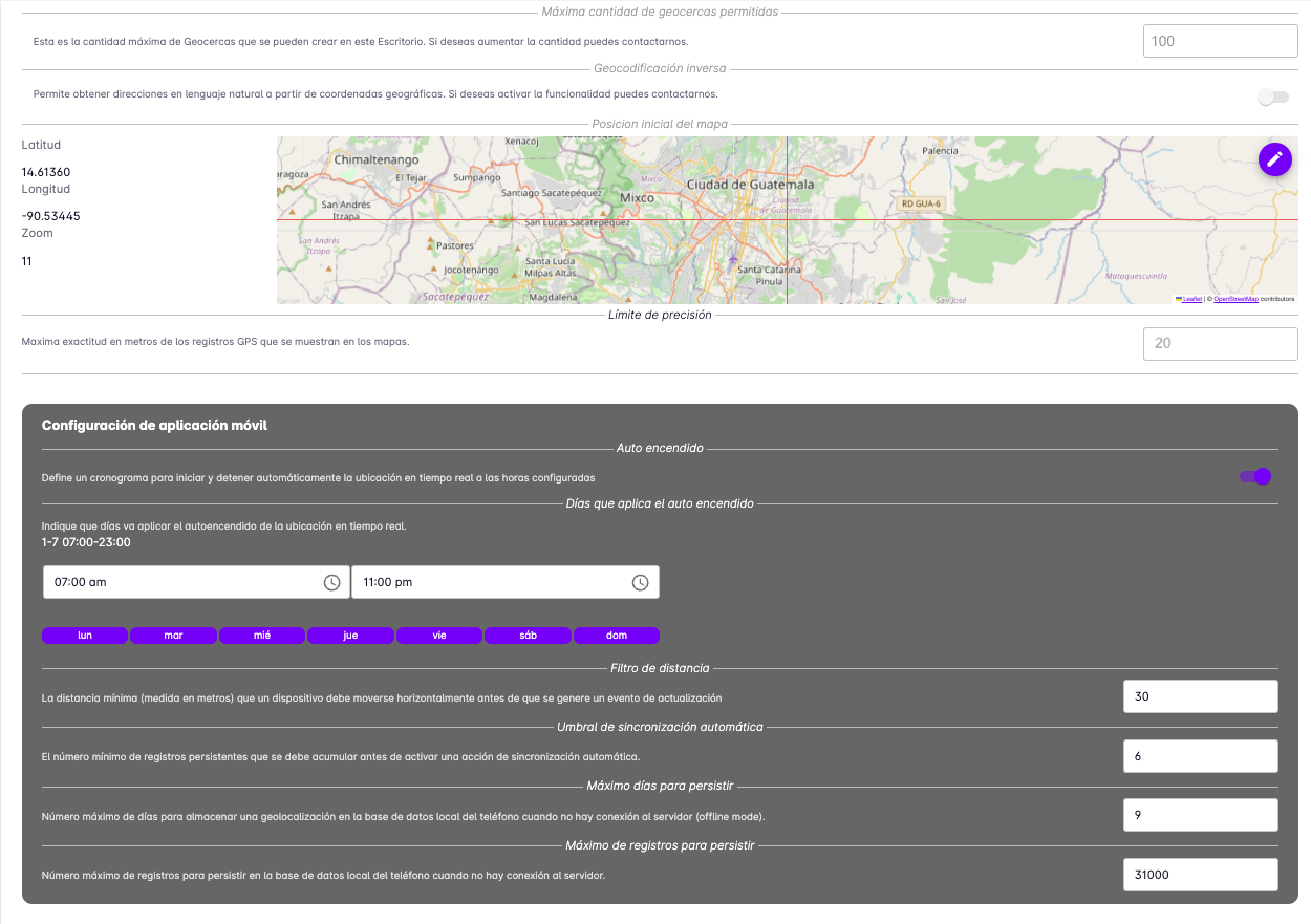 En la sección de ubicación están las configuraciones que aplica a la ubicación de usuario, geocercas y ajustes adicionales para la App móvil.