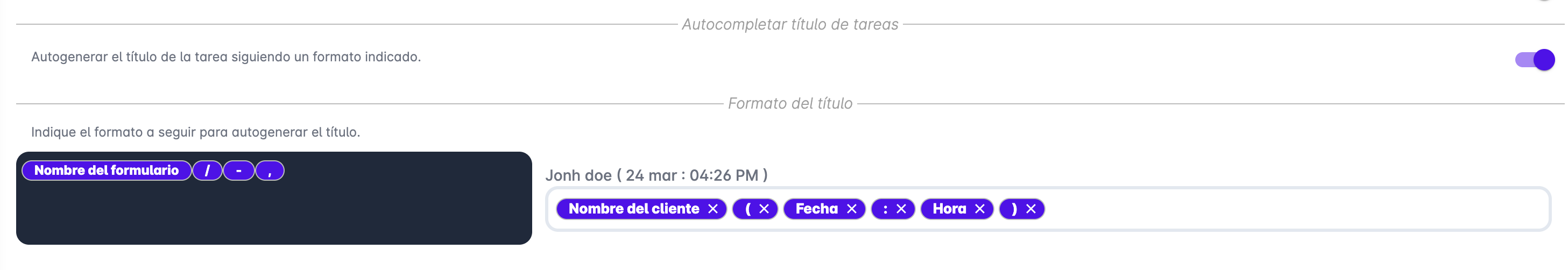 - Formato de autocompletado de título de tareas: - Puedes indicar el formato que se usará para autocompletar el título de las tareas. Arrastra en la posición que desees los campos disponibles para autocompletar el título.