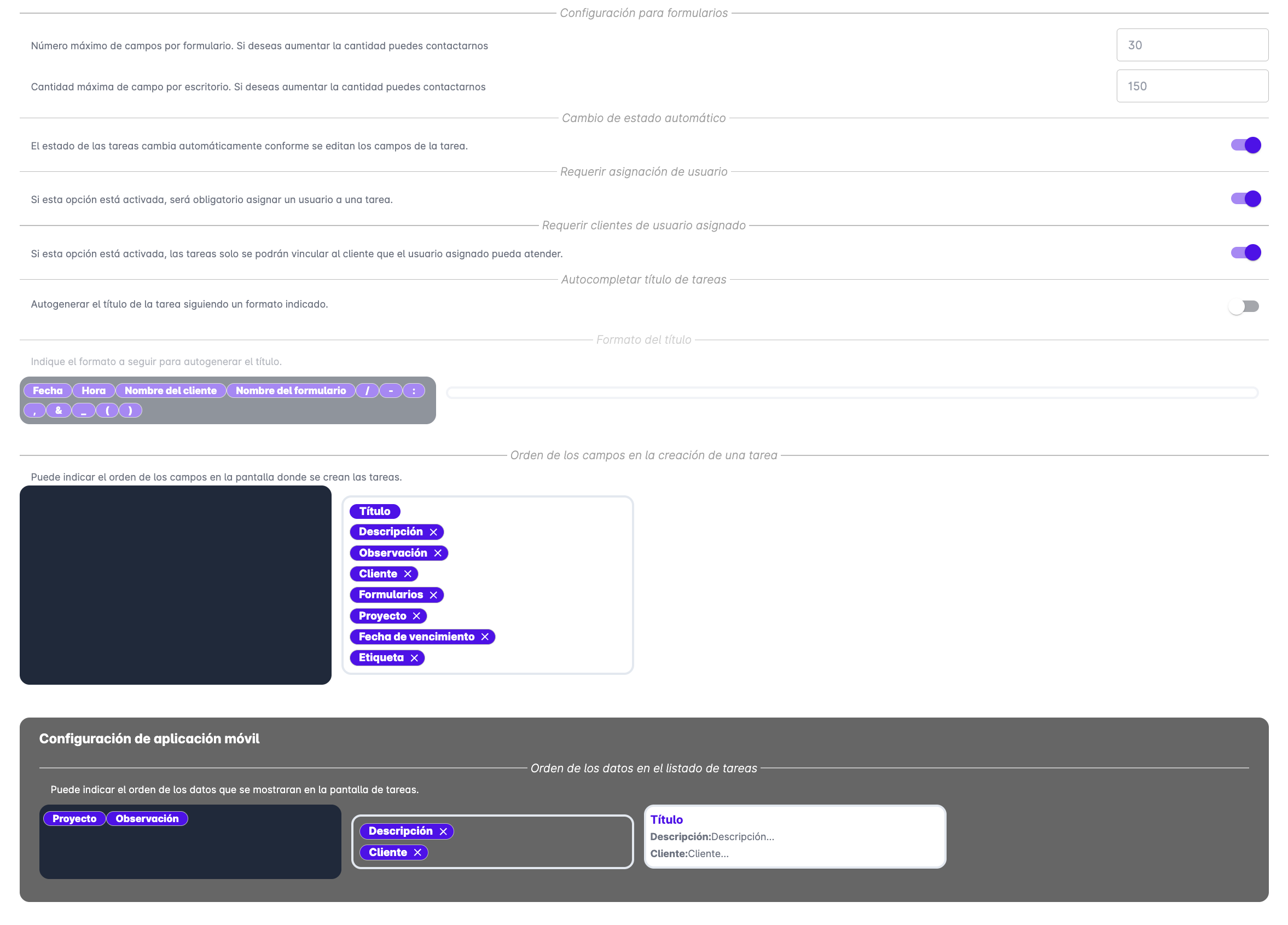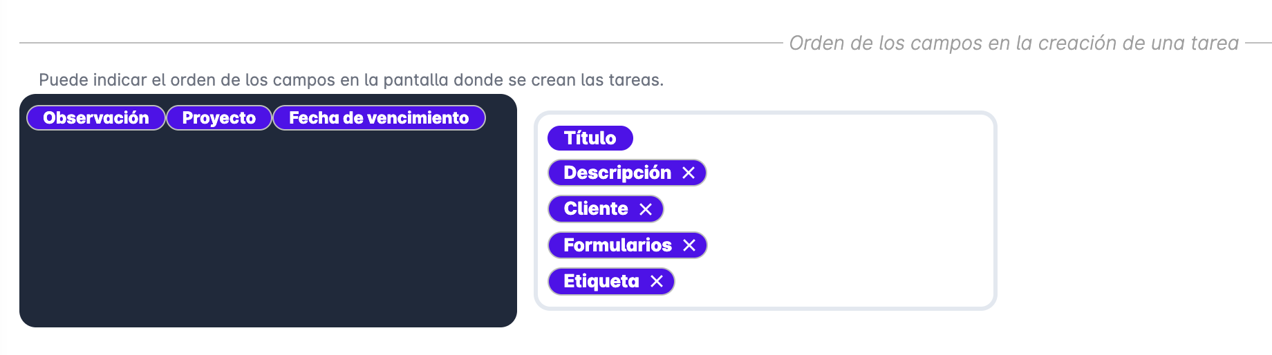 - Orden de los campos en la creación de una tarea: - Al crear o editar tareas puedes controlar que campos mostrar y el orden en que se mostrarán. Arrastra en la posición que desees los campos disponibles.