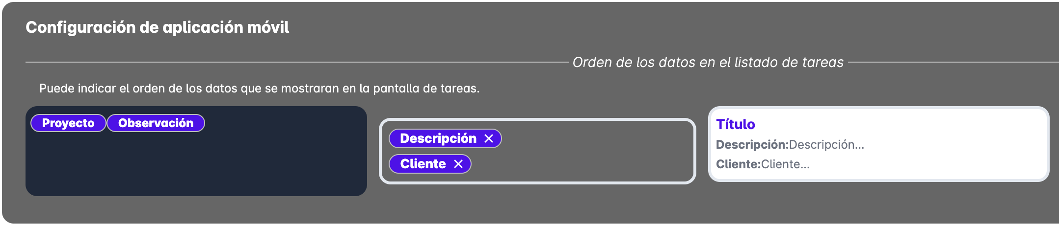 - Orden de los datos en el listado de tareas - Arrastra en la posición que desees los campos disponibles para mostrar en el listado de tareas de la App móvil.