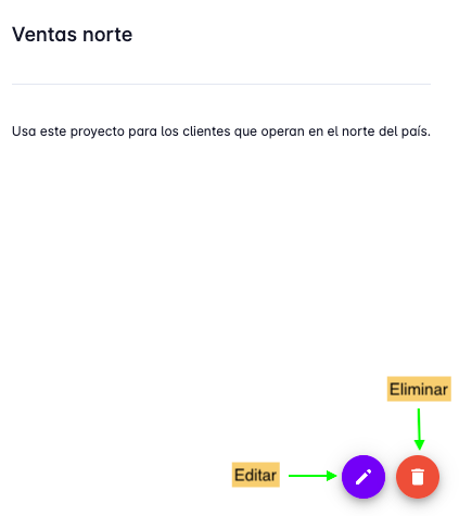 Para eliminar un proyecto, haga clic en el proyecto que desea eliminar, se mostrará el panel del detalle de proyecto y en la parte inferior derecha del panel, haga clic en el botón Eliminar.