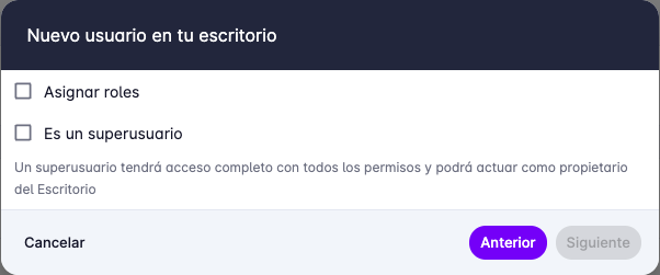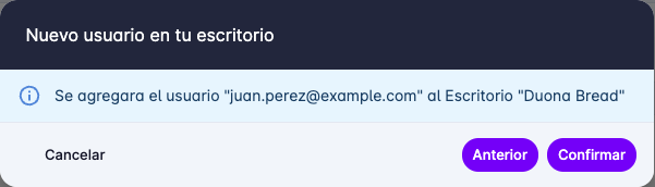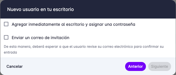 - Agregar inmediatamente: El usuario será agregado al Escritorio sin necesidad de confirmación. Esto se hace para agilizar la creación de usuarios sin esperar a que el usuario revise su correo electrónico.