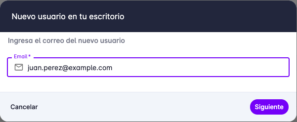 Para agregar un usuario hay que seguir una serie de pasos, en el primer paso se debe ingresar el correo electrónico del usuario.