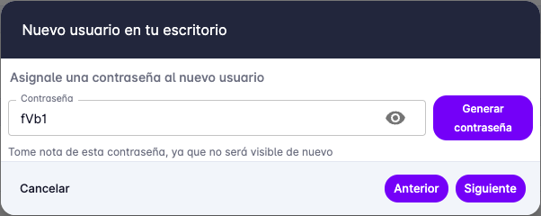 Si eliges agregar inmediatamente, se te pedirá crear la contraseña que tendrá el usuario. Puedes elegir una contraseña o dejar que el sistema genere una contraseña aleatoria. Es importante copiar la contraseña generada, ya que no se mostrará nuevamente.