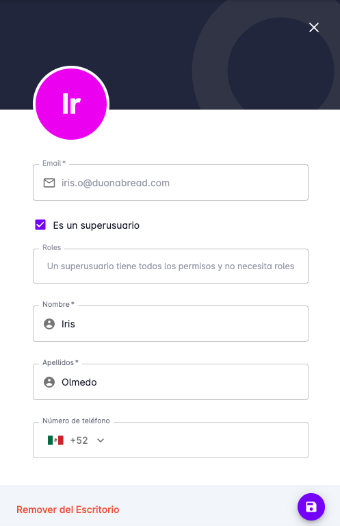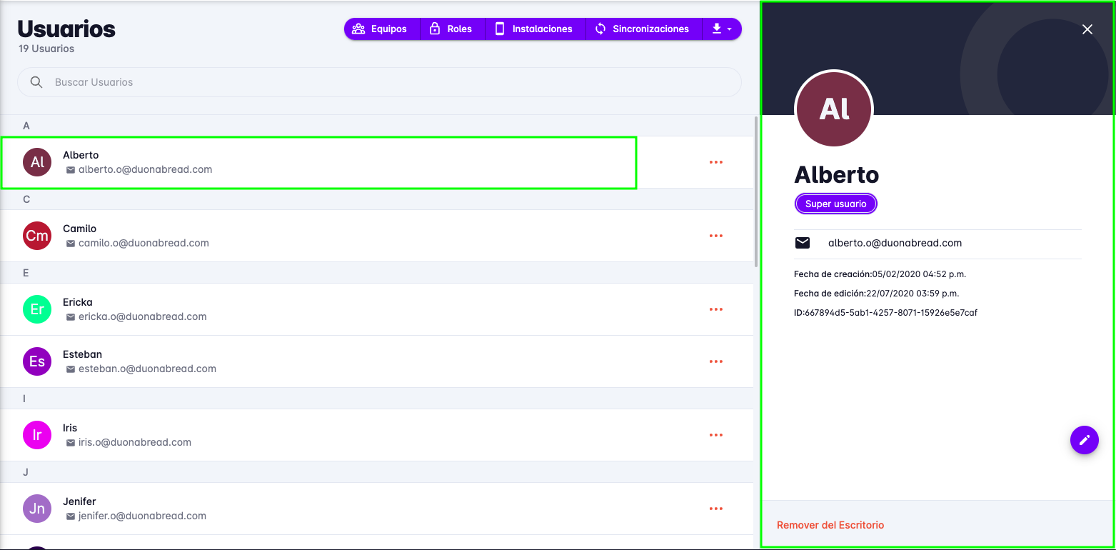 Para remover un usuario, haga clic en el usuario que desea remover, se mostrará un panel con la información del usuario.