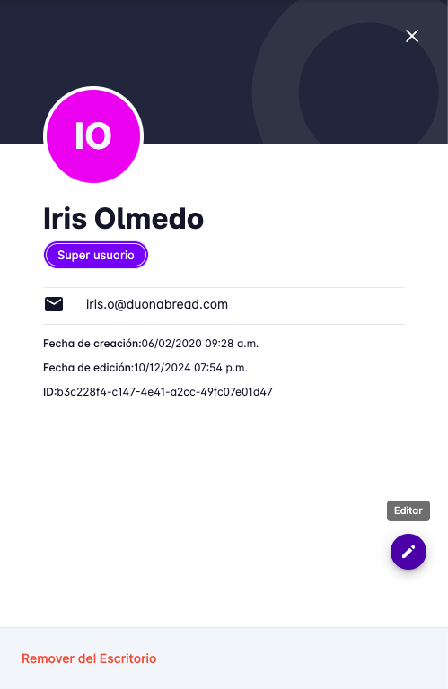 Para editar un usuario, haga clic en el usuario que desea editar, se mostrará un panel con la información del usuario. En la parte inferior derecha del panel, haga clic en el botón Editar.