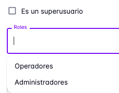 Para los roles puedes indicar si deseas que el usuario sea super-usuario o que tenga roles con permisos restringidos.