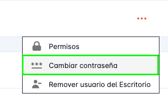 Ubica al usuario que deseas cambiarle la contraseña y haz clic en el botón de tres puntos y luego presionar el botón Cambiar contraseña.