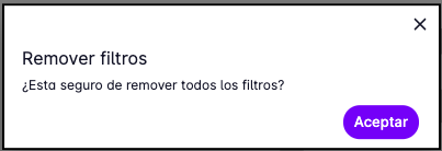 Al presionar el botón de remover filtros, se mostrará un mensaje pidiendo una confirmación.