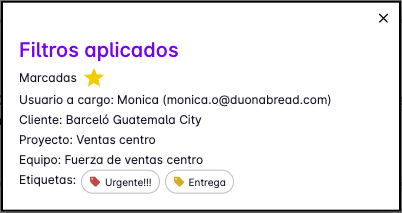 Está la opción de filtrar por usuario, estado, cliente, fechas, marcadas, proyecto, equipos, formulario y etiquetas.