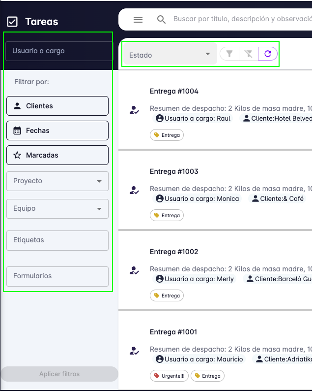 Para filtrar las tareas, utiliza los botones que están en la parte izquierda y media de la pantalla.